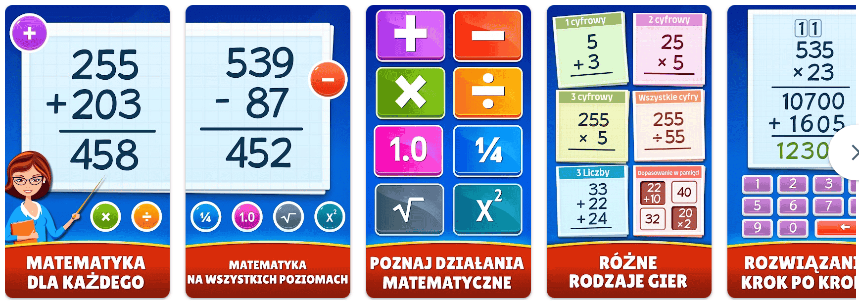 źródło: zrzut ekranu: https://play.google.com/store/apps/details?hl=pl&id=com.rvappstudios.math.games.kids.addition.subtraction.multiplication.division