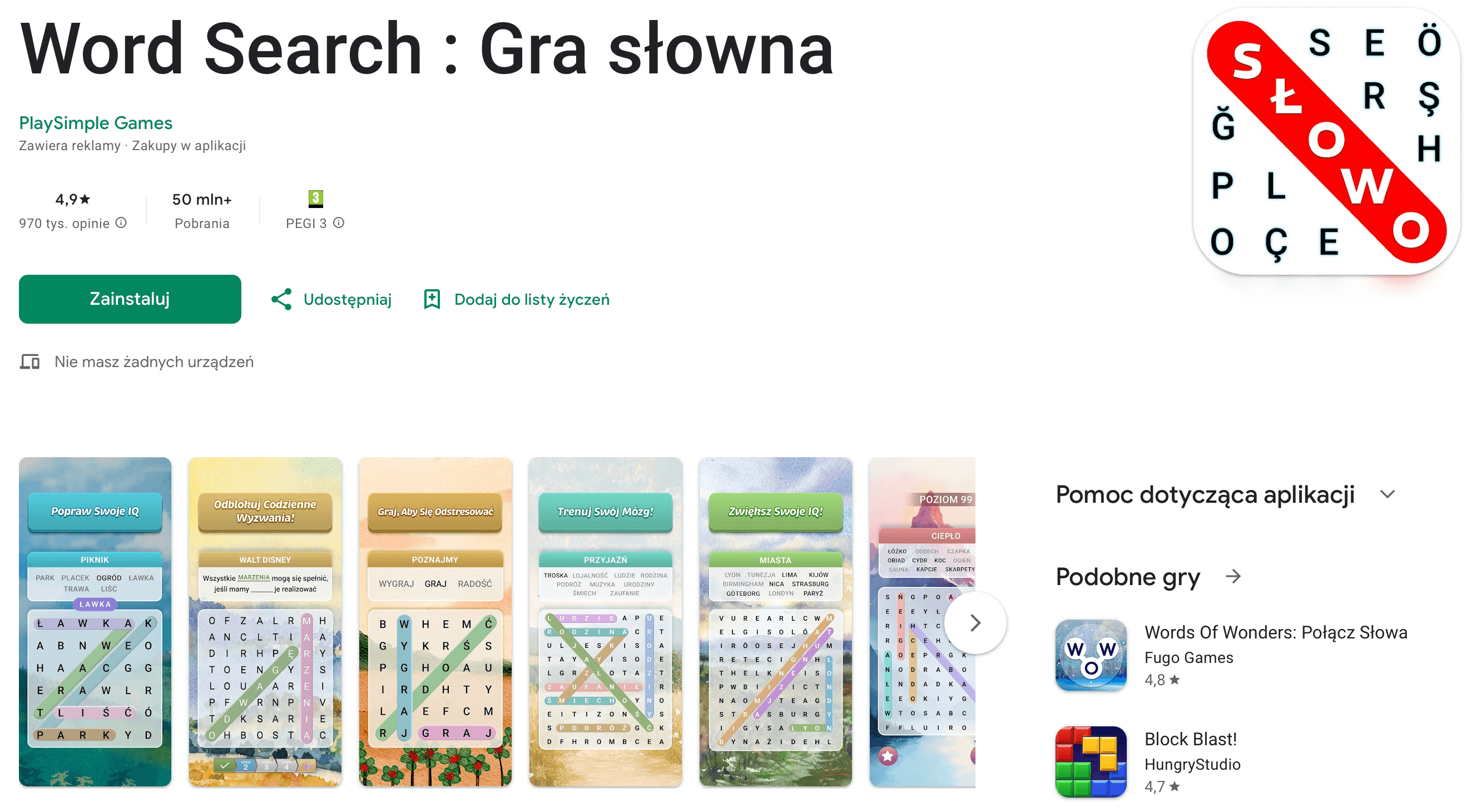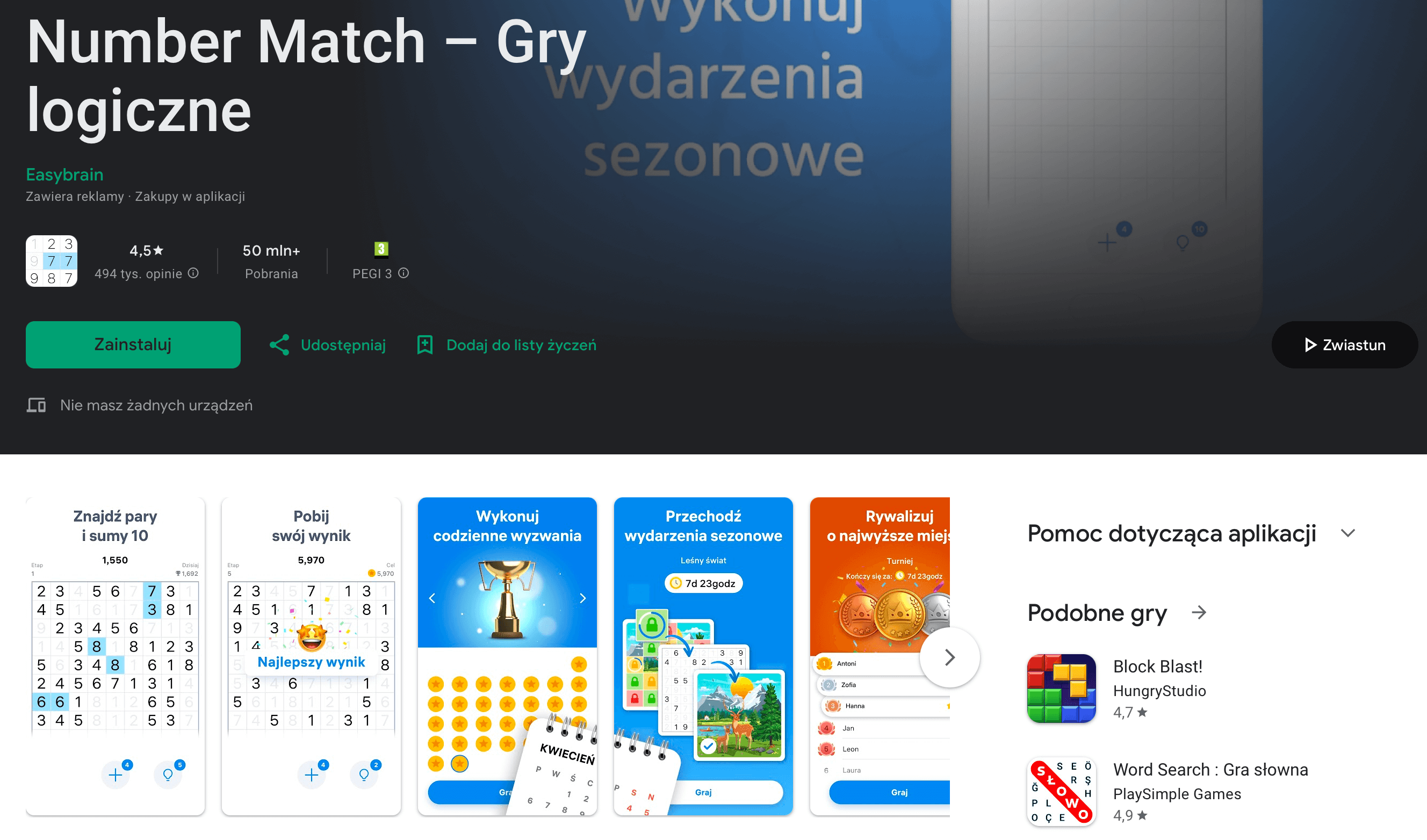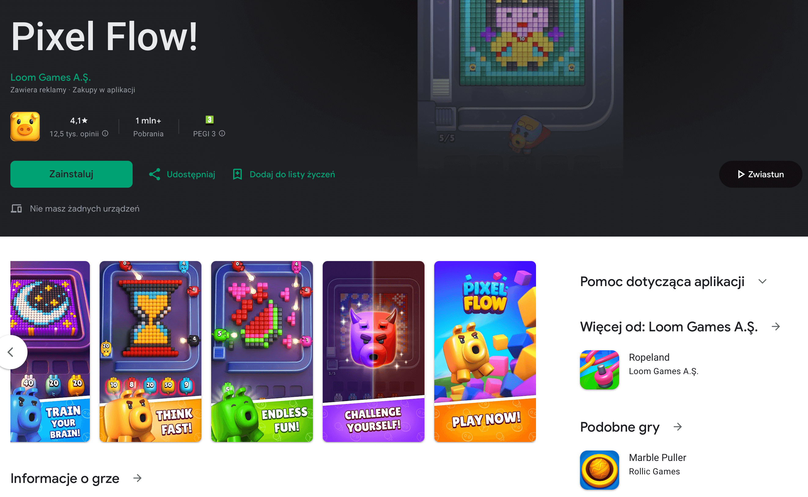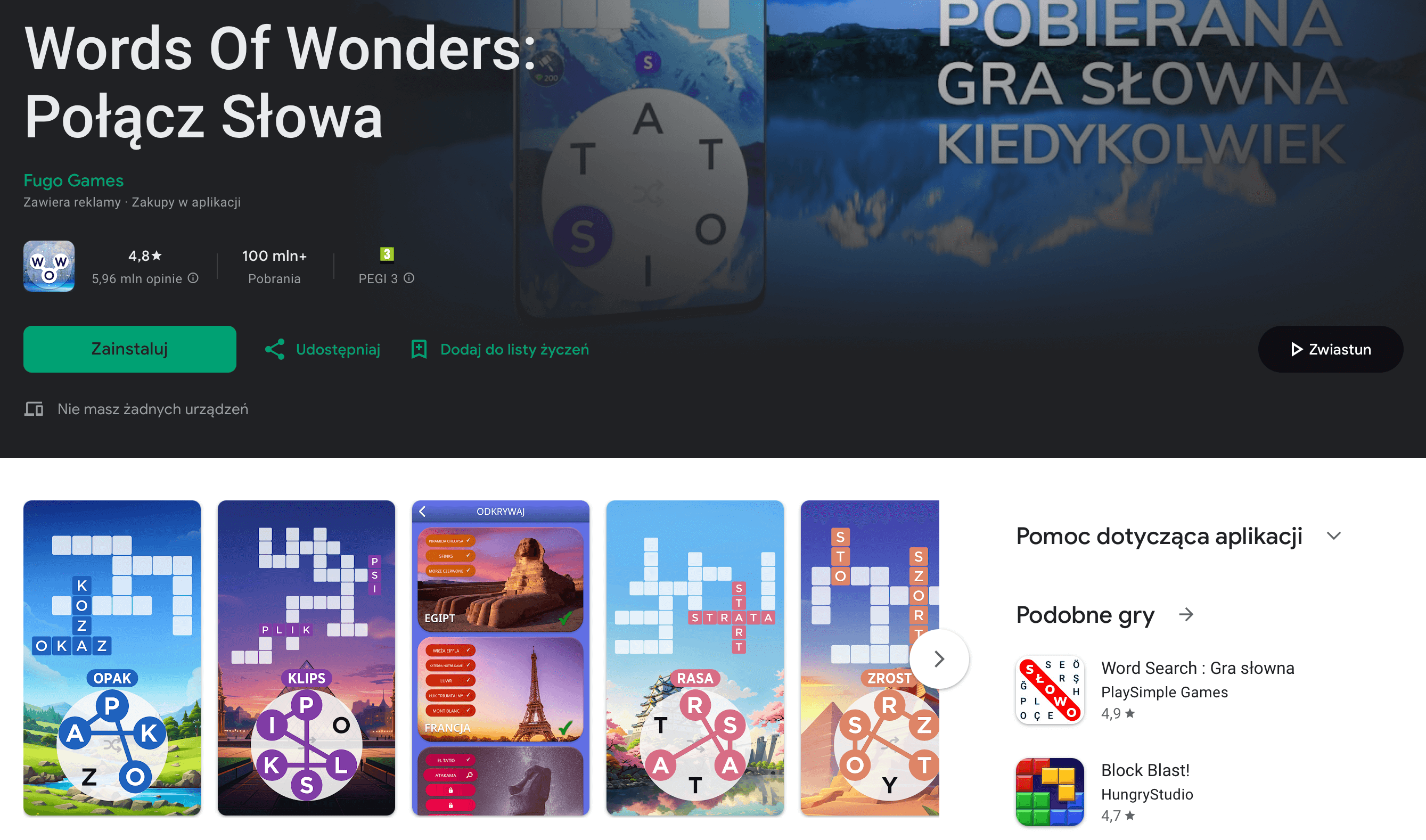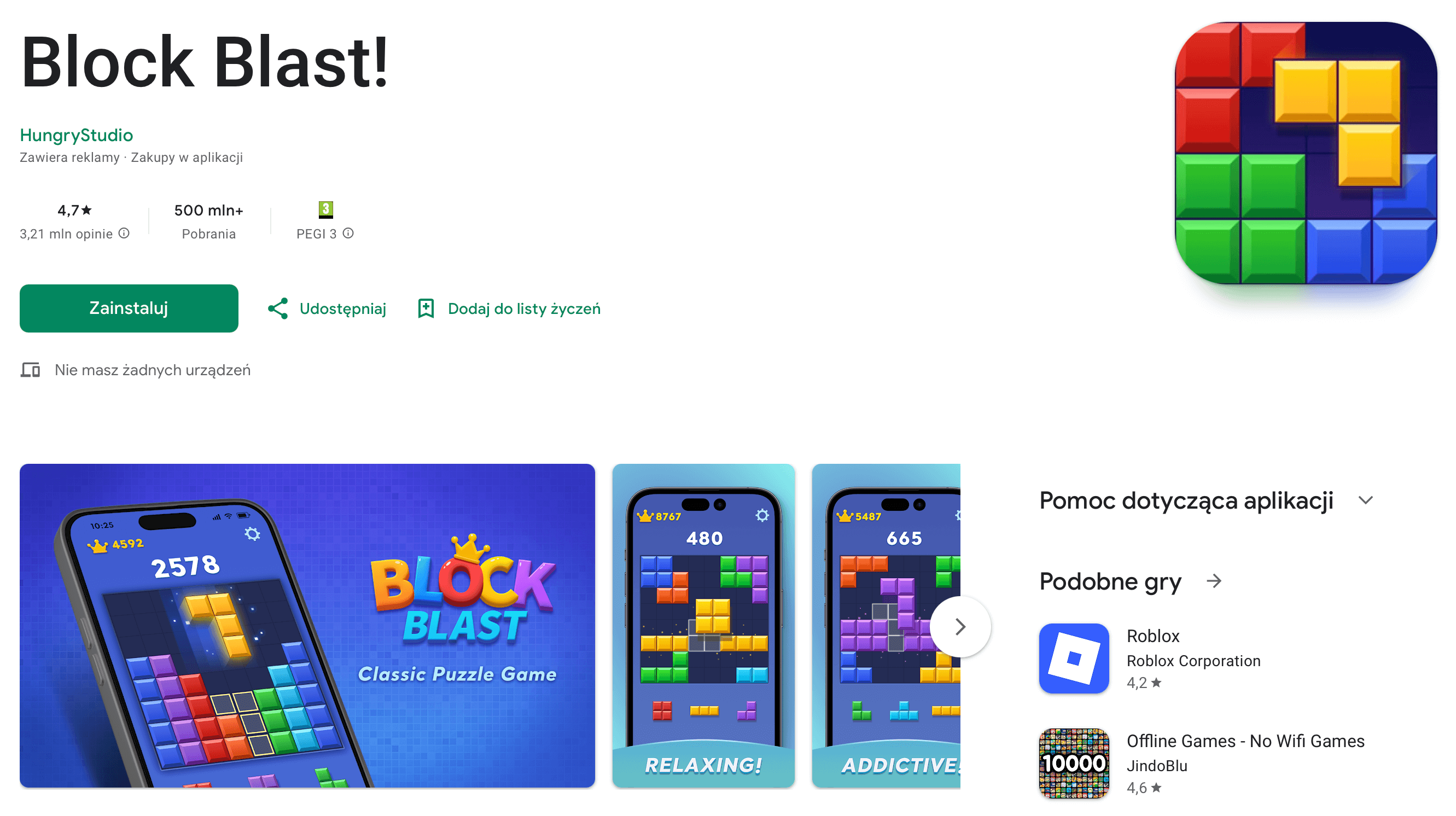 Najczęściej pobierana gra w polskim Google Play (kategoria Gry) w 2025 roku. Układasz kolorowe bloki na planszy tak, by wypełnić linie i zdobywać punkty – proste zasady, szybkie rundy i ogromny potencjał „jeszcze jednej próby”.
