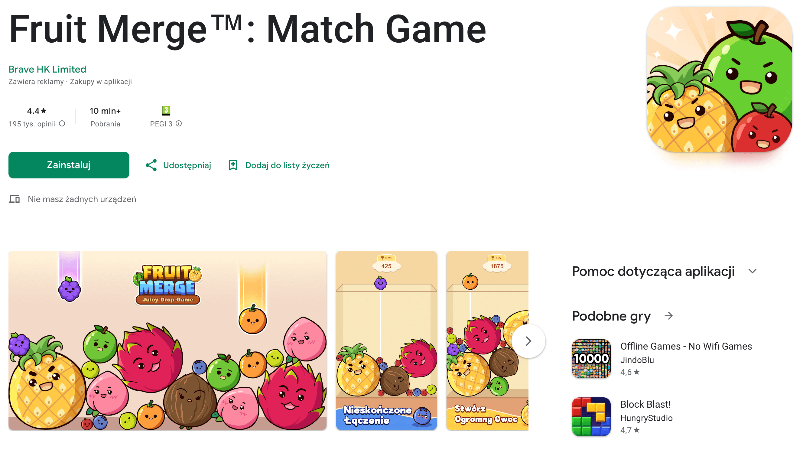 Łączysz owoce w większe kombinacje, zdobywając coraz wyższe wyniki. To kolejna gra typu „merge”, ale z bardzo kolorową, przyjemną oprawą.