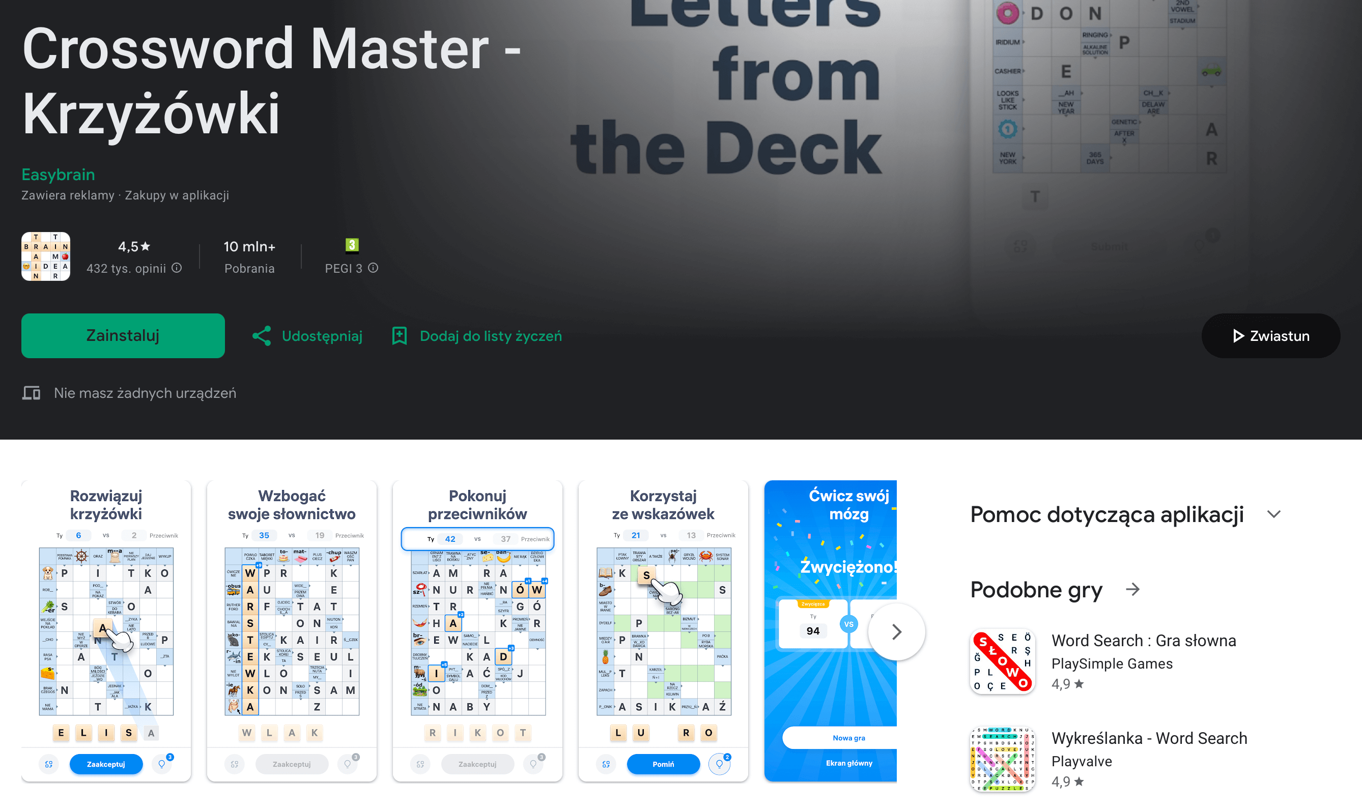Rozbudowana gra krzyżówkowa z wieloma poziomami trudności. Spodoba się wszystkim, którzy lubią tradycyjne łamigłówki słowne w nowoczesnej oprawie.